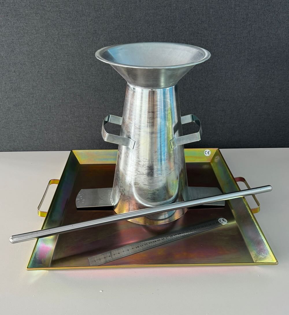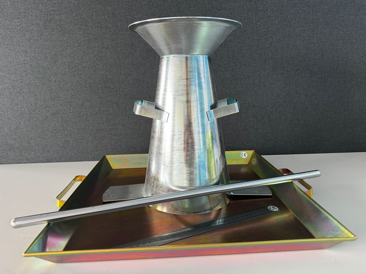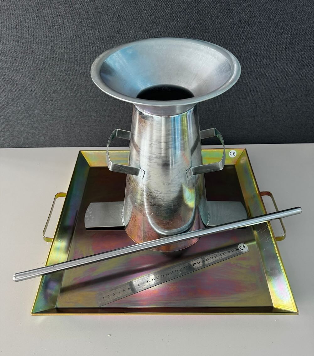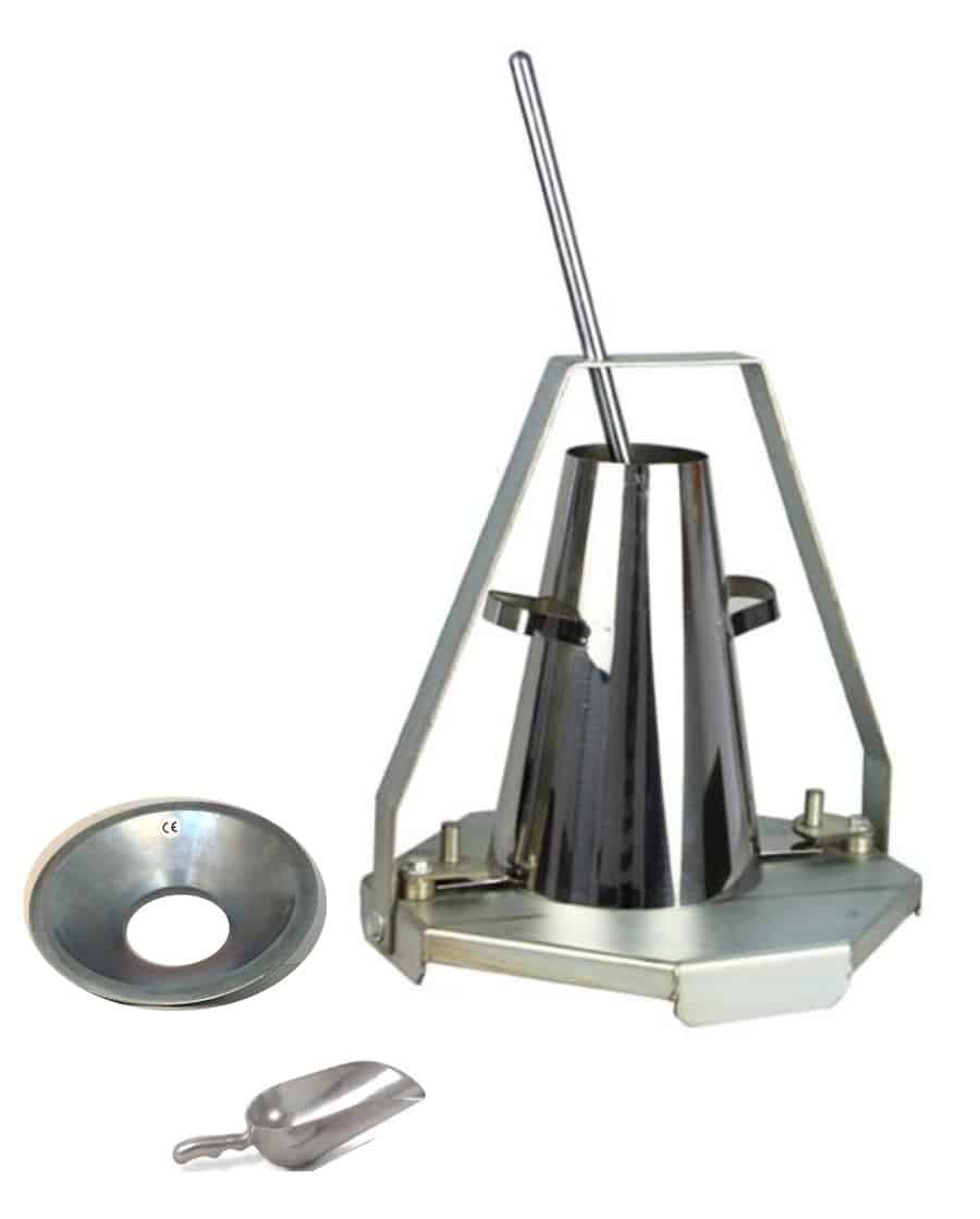 Cône d’affaissement dit cône d’Abrams pour tester l’affaissement du béton frais en laboratoire ou in situ, selon la norme EN 12350-2.